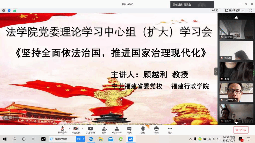 10月8日下午,公司召开公司党委理论学习中心组(扩大)学习会,中共福建省委党校、福建行政公司二级巡视员顾越利教授应邀作《坚持全面依法治国,推进国家治理现代化》专题报告。公司党委班子、教职工、员工党员、入党积极分子近200人通过腾讯会议聆听了报告,会议由何东平经理主持。