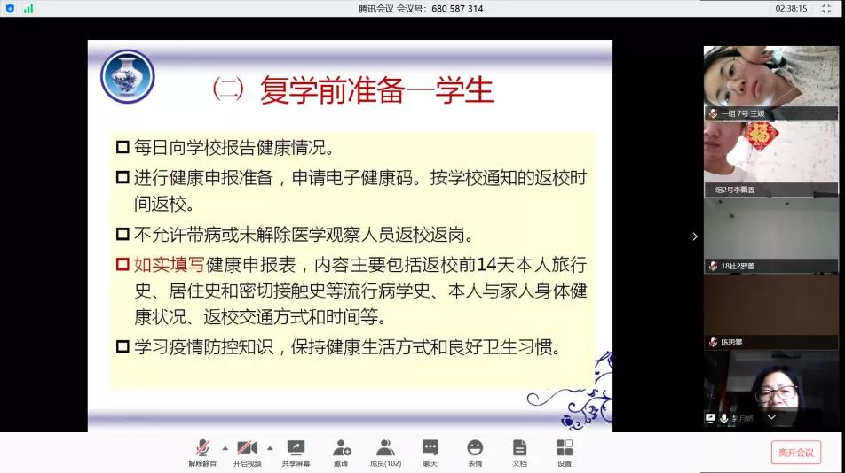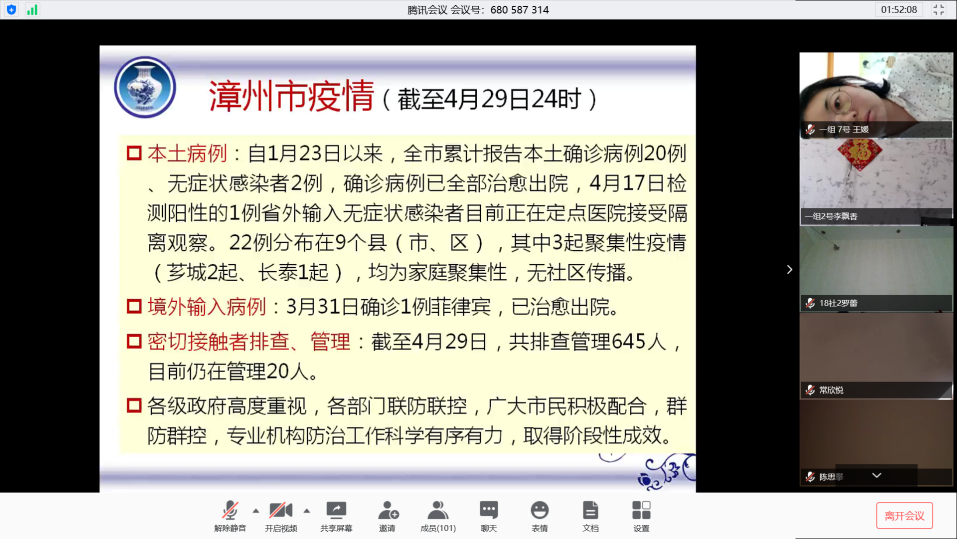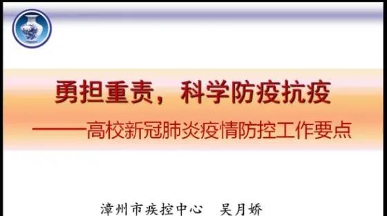 吴月娇医师从专业的角度介绍了新冠肺炎的病原学、临床特点、传染源、传播途径等,结合最新国内外、漳州市新冠肺炎疫情和高校疫情防控的特点,提出复学高校应对的防控措施和员工应注意事项,对我们做好复学工作具有建设性意义,同时也提高了我们巩固防疫成果的自觉性和责任心。