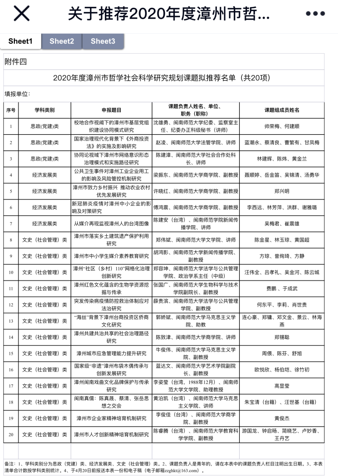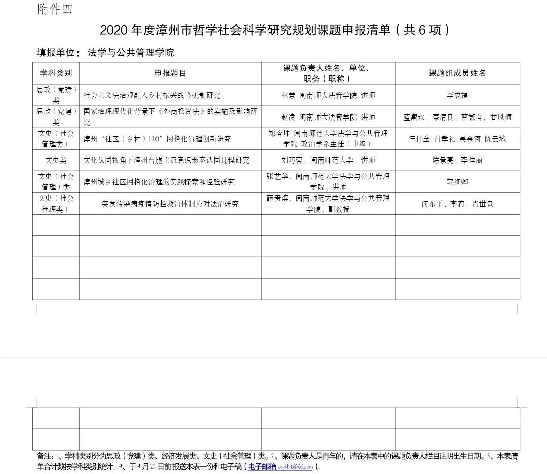 在防疫抗疫的日子里,公司党委坚持“防疫促学”两手抓的方针,号召老师们不忘初心,居家不离岗,停课不停研;同时,积极组织开展漳州市2020年度哲学社会科学研究规划课题项目申报工作,公司教师积极响应,共申报项目6项,参与人数17人,是历年申报漳州市社科项目人数最多项目最多的一次,占全校项目1/7。经公司评审,《国家治理现代化背景下<外商投资法>的实施及影响研究》(赵凌)、《漳州“社区(乡村)110”网格化治理创新研究》(郑容坤)和《突发传染病疫情防控救治体制应对法治研究》(薛贵滨)三个项目突围而出,获得推荐。