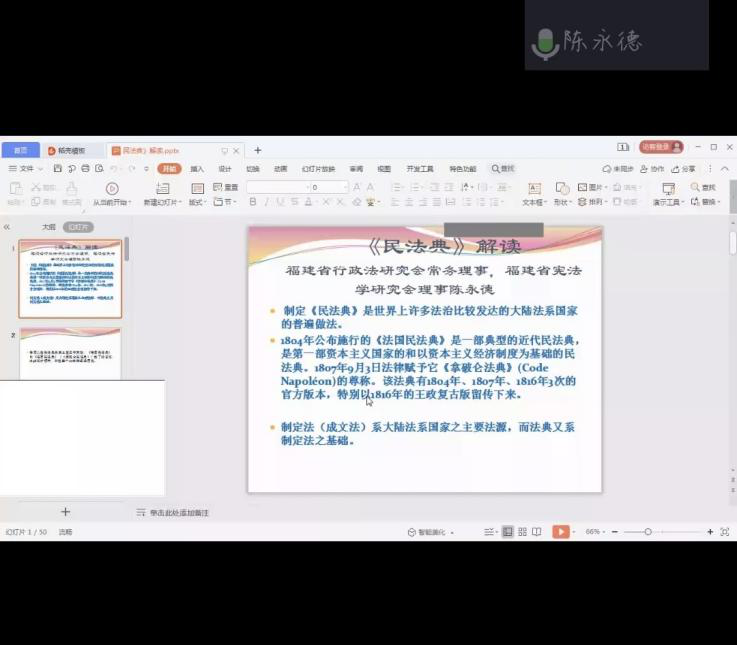 本次课程,陈老师带领学员们回顾了人类文明史,介绍了编纂民法典是具有重要标志意义的法治建设工程,是一个国家、一个民族走向繁荣强盛的标志,并以1804年公布施行的《法国民法典》为例,梳理了其修改历程。在解读分析我国《民法典》时,陈永德老师着重为大家介绍了我国民法典的三个特色及六大原则。深入理解民法典这“三个特色”及“六大原则”,是贯彻实施民法典的重要前提,也是构建我国民法理论体系和话语体系的重要内容。