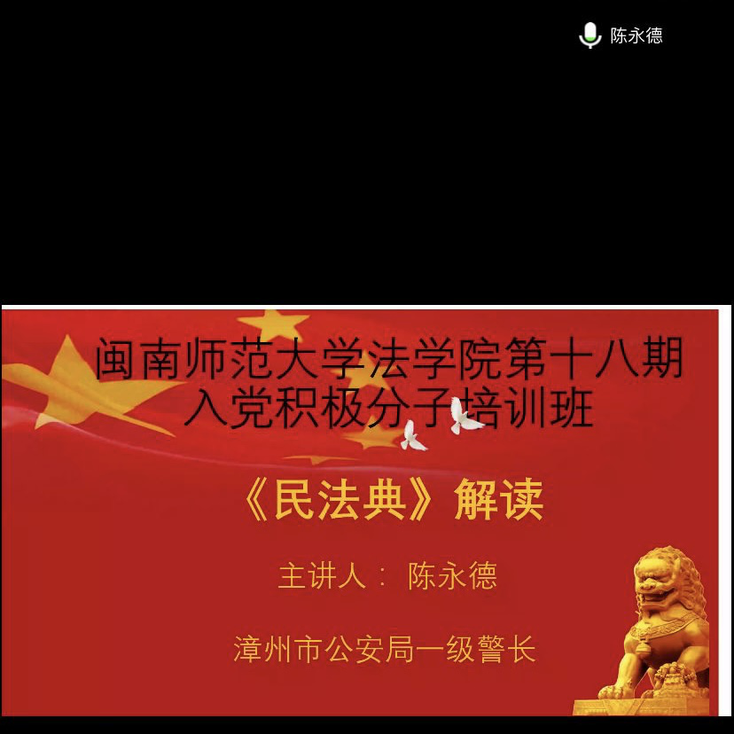 11月26日晚上19时30分,公司分党校第十八期入党积极分子培训班第四讲通过线上方式举行。本次党课以“《民法典》解读”为主题,由漳州市公安局一级警长陈永德老师主讲。