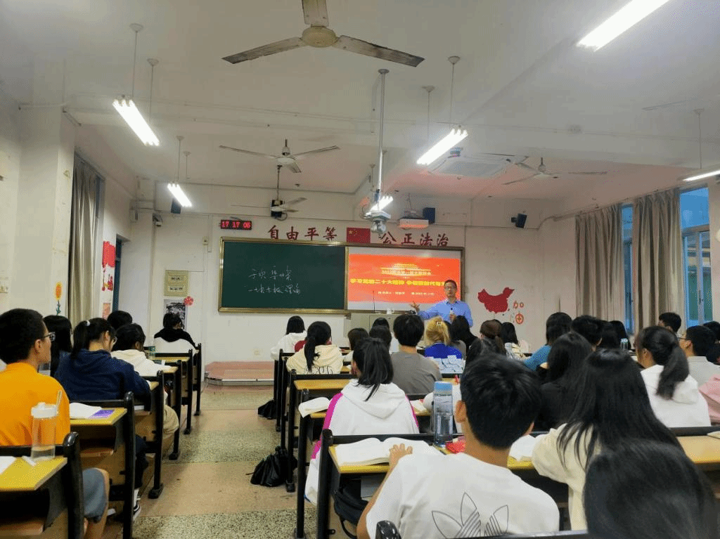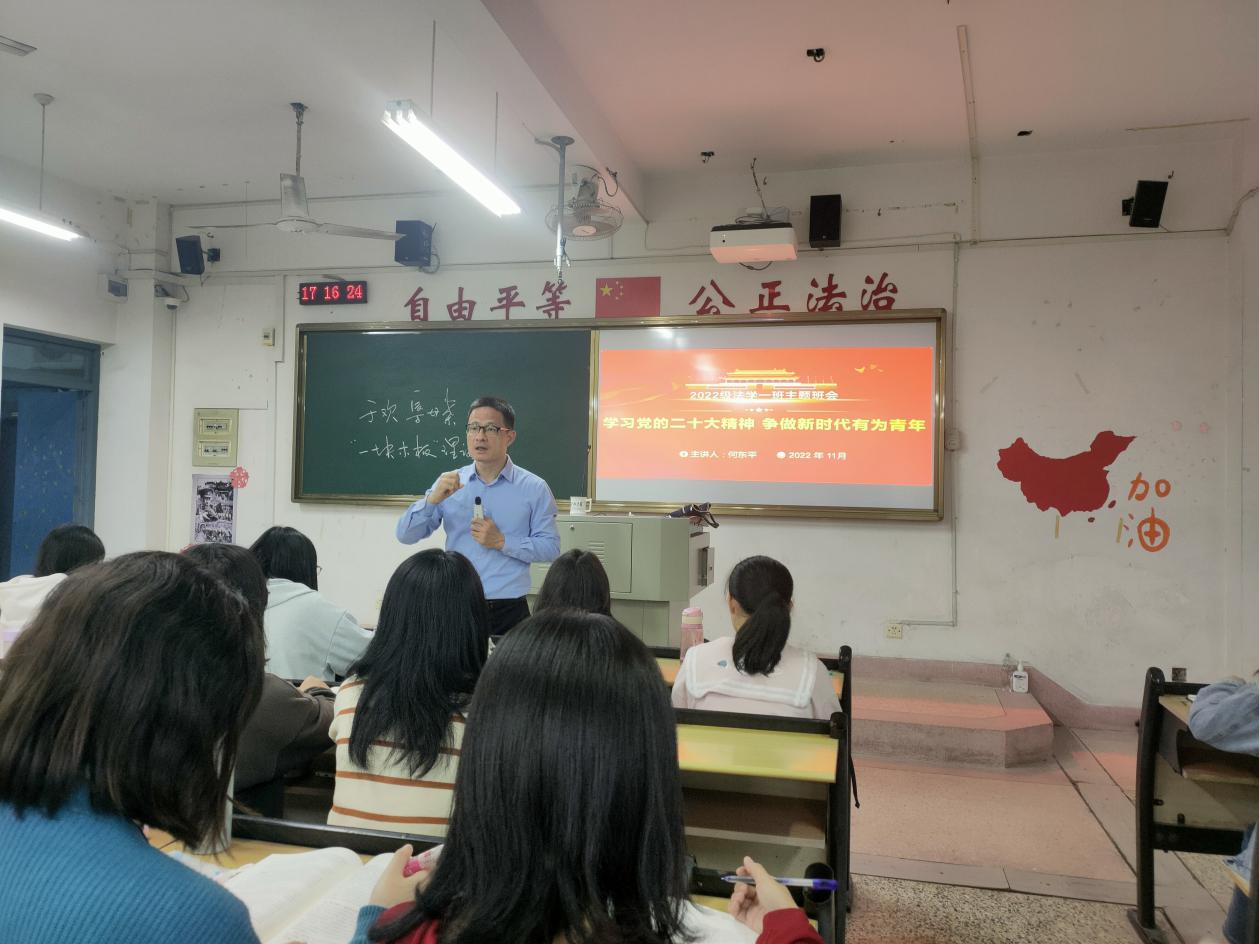 11月2日下午,2022级法学一班在博西601召开主题班会。班会由PA视讯官网何东平经理主讲,号召同学们“学习贯彻党的二十大精神,争做新时代有为青年”。
