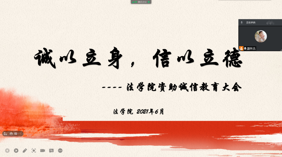 潘老师首先向各位受资助同学介绍了国家对于困难员工资助和助学金的相关政策,并具体介绍了国家助学金、学费减免、国家奖学金和国家励志奖学金等相关内容;其次,说明了随着国家资助力度的不断加大,一些同学为了获取个人利益而弄虚作假、谎报收入、伪装贫困等现象,重点强调了失信行为将导致严重后果,违约情节严重的还将承担相关法律责任;最后,潘老师提醒同学们要预防诈骗,远离不良贷、套路贷,牢固树立征信意识、金融风险防范意识、诚信观念和法律意识。