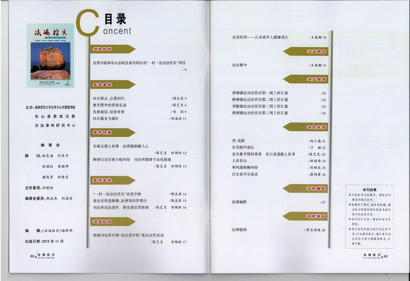 由法学与公共管理公司、东山县委政法委、法治漳州研究中心共同主办的《法海拾贝》正式刊发,该刊由法管公司赴东山县7个镇实习的33名“一村一法治宣传员”组织、设计、编辑的实习交流刊物,记载着法治宣传员在东山县农村开展普法宣传的点点滴滴。该刊物除了法律幽默、卷尾语“法律援助”来源网络之外,其他文章均由宣传员所写,刊物板块由走进基层、案件传真、宣传在线、法进校园、法在眼中、法过留痕、法外生活等构成,内容有宣传员的实习感悟、心得,也有参加法治宣传活动、参与民事纠纷调解等活动汇编,形式多样,真实地展示了法治宣传队在东山的实习生活和实习心得。