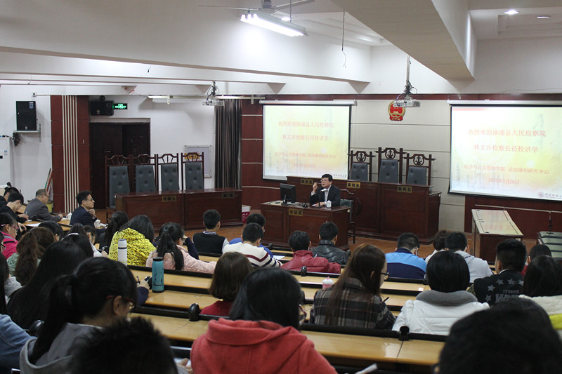 2015年3月26日晚,法学与公共管理公司、法治漳州研究中心邀请漳浦县人民检察院检察长林文井同志来校做客检察官论坛第五讲,主讲题为《社会主义法治理念与基层检察实践》的专题讲座,法学与公共管理公司经理何东平教授主持讲座,副经理黄耀明副教授等部分师生共计300余人参加了讲座。