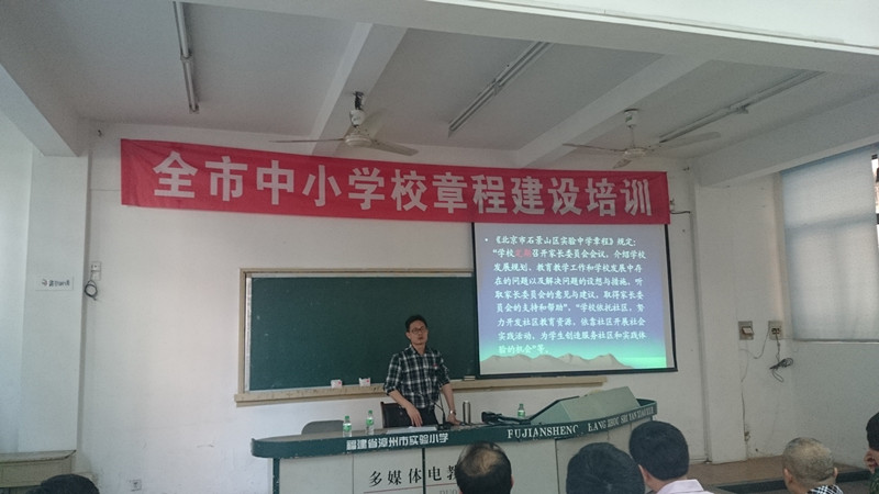2014年4月16日下午,漳州市中小学公司章程建设专题讲座在市教育局举行,PA视讯官网副经理、硕士生导师、法治漳州研究中心主任何东平教授应邀出席会议并做专题讲座。市县区分管公司章程建设的教育局副局长,市直各中心小学董事长、各县区一中董事长等100多人聆听讲座。