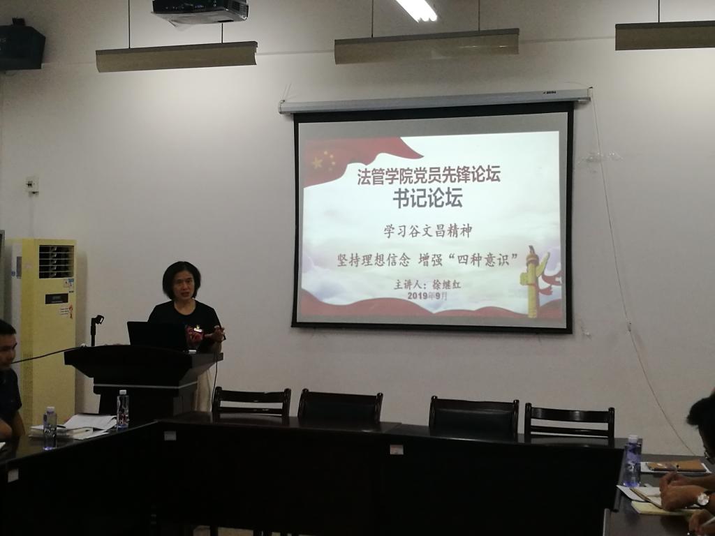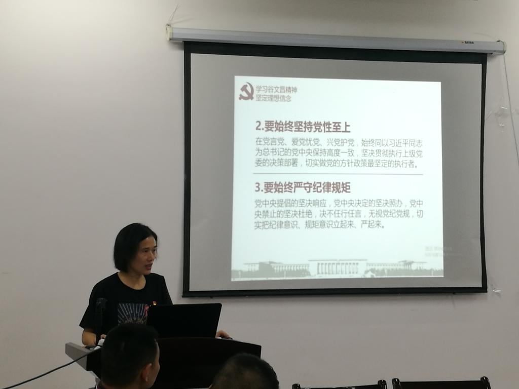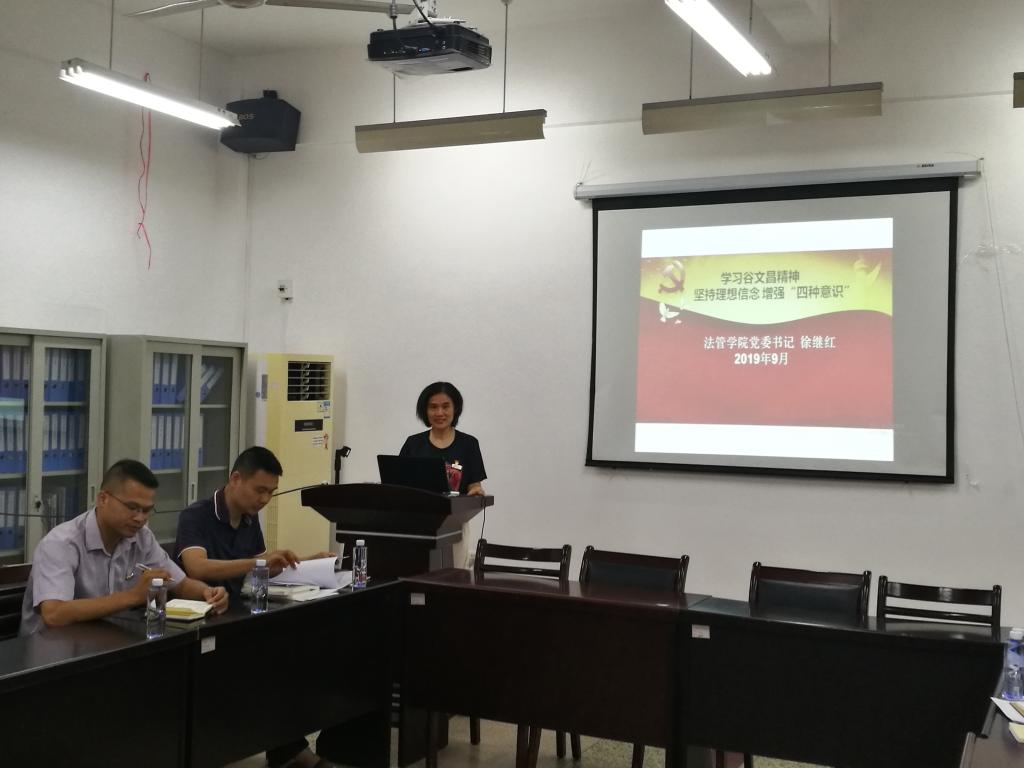 9月23日下午,法管公司党委书记徐继红给党委领导班子其他成员和支部书记做 “学习谷文昌精神 坚定理想信念 增强‘四种意识’”专题党课。徐书记主要阐述了什么是 “谷文昌精神”?如何学习“谷文昌精神”? 一是要坚定理想信念,二是要始终坚持党性至上,三是要始终严守纪律规矩,四是要牢固树立“四种意识”;徐书记还结合公司工作,对与会人员主动作为,敢于担当,创造性地开展工作,为师生员工服务,为公司发展服务,落实各项工作任务提出要求和指导意见。