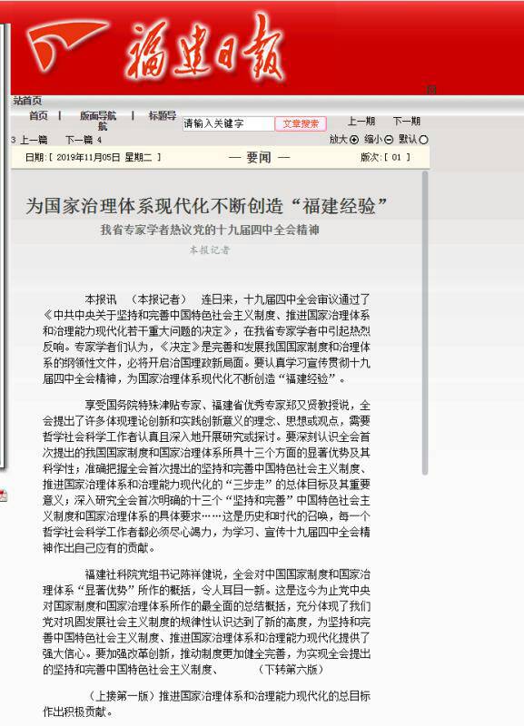 福建日报以《为国家治理体系现代化不断创造“福建经验”——我省专家学者热议党的十九届四中全会精神》为题头版登载了公司党委书记徐继红的热议。徐书记表示,作为法学专业的教师和员工,更要加强国家治理体系和治理能力理论研究,在人才培养体系方面融入新的理念和要求,进一步发挥高校专家的智库作用,推动高校和地方法治治理的联系和互动。