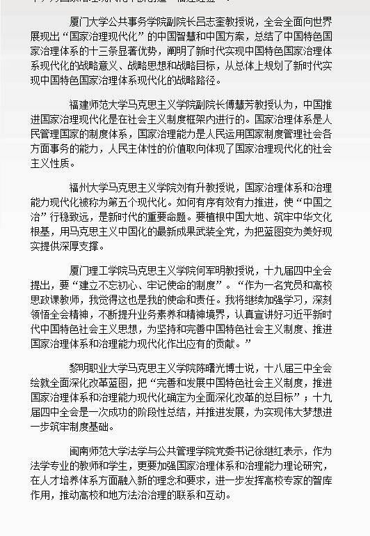 近日,十九届四中全会审议通过《中共中央关于坚持和完善中国特色社会主义制度、推进国家治理体系和治理能力现代化若干重大问题的决定》,在我省专家学者中引起强烈反响。福建社科院、福建行政公司、省政府发展研究中心、厦门大学和PA视讯等多位专家对《决定》积极发言讨论。