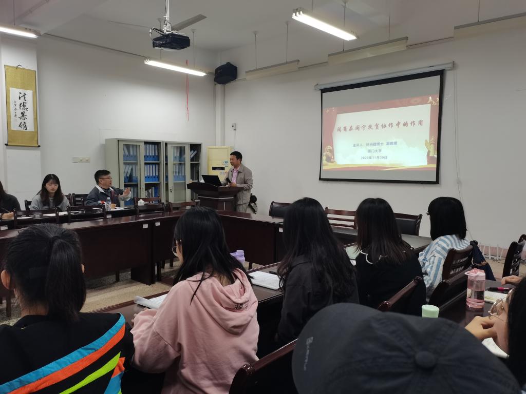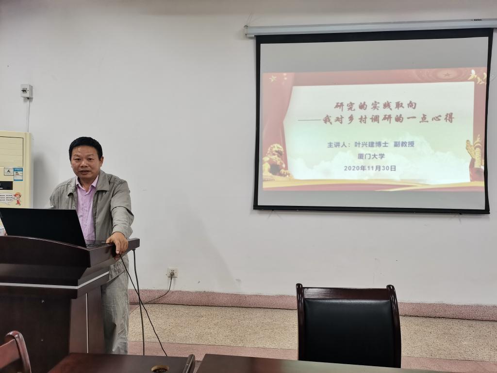 11月30日,厦门大学马克思主义公司叶兴建博士到公司开设两场讲座,分别为“闽商在闽宁扶贫工作中的作用”与“研究的实践取向—我对乡村调研的一些心得”,讲座由公司郭细卿副经理主持,2020年级社工专业研究生及公司部分教师听取讲座。