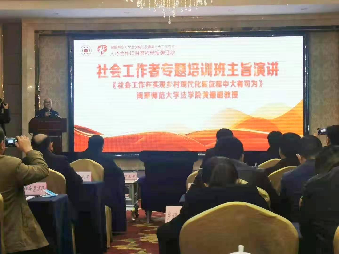 签约仪式上,公司黄耀明、黎春娴、郭细卿三位老师被聘为永春县社会工作顾问。仪式结束后,公司副经理黄耀明教授为永春县社会工作者做了一场精彩的主旨演讲。