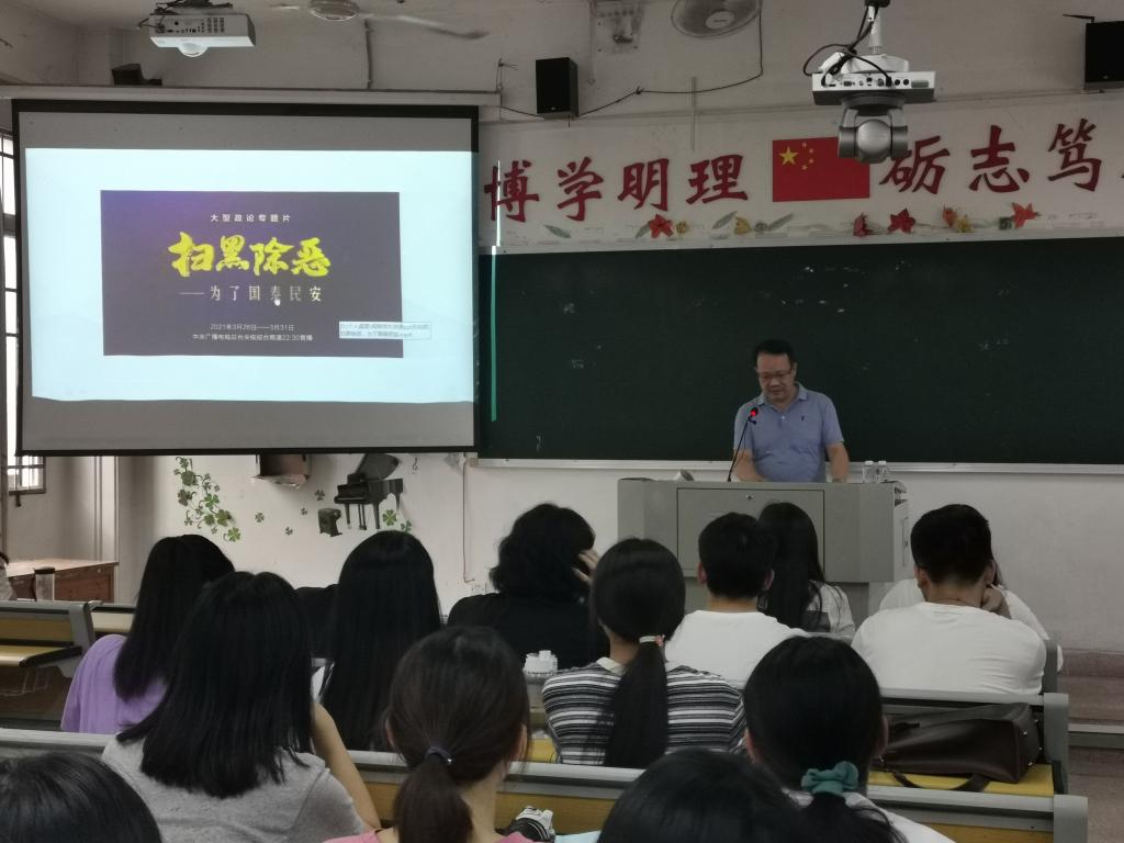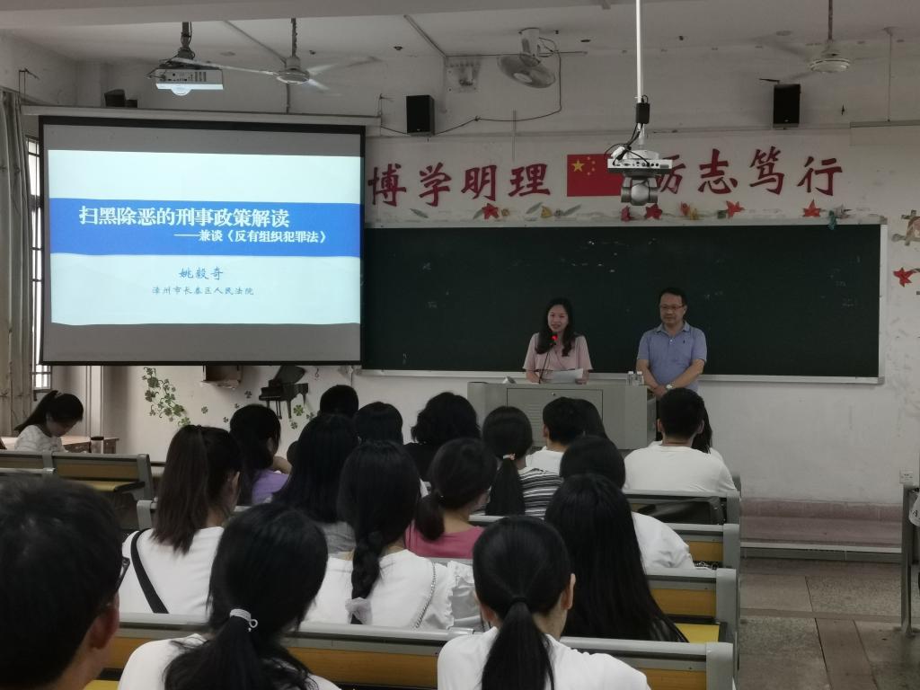 讲座中,姚经理分别解读了刑事政策、黑社会性质组织犯罪、扫黑除恶的刑事政策文件、《反有组织犯罪法》草案、扫黑除恶的典型案例,从在一线工作的经验分享了扫黑除恶的重大进展。本次讲座理论与案例相结合,阐述了扫黑除恶的重要意义。 在提问讨论环节,同学们踊跃发言,姚经理对同学们的提问逐一进行解答,在座同学受益匪浅。