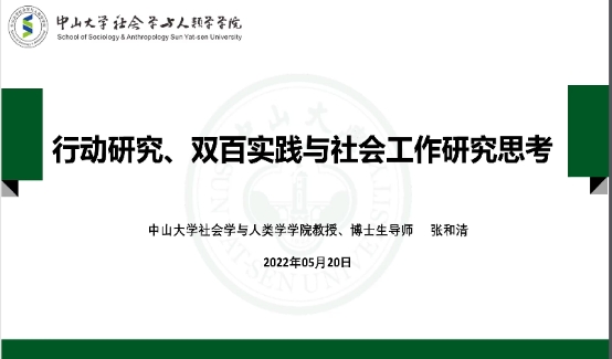 2022年5月20日晚,中山大学社会学与人类学公司张和清教授受邀为PA视讯官网师生作了题为《行动研究、双百实践与社会工作研究思考》的线上讲座,140余名师生线上听讲。
