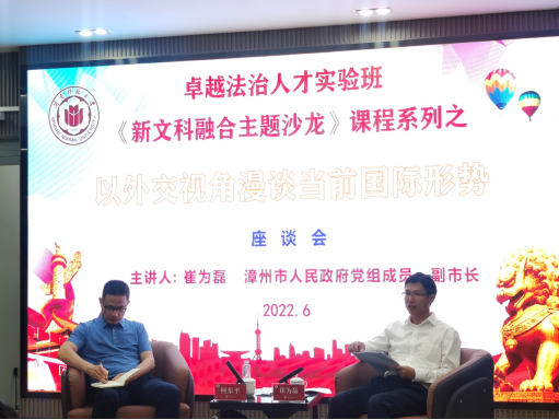 6月9日晚上七点半,公司于达理楼南区206教室举行了新文科融合主题学术沙龙——以外交视角漫谈当前国际形势。本次沙龙邀请了漳州市人民政府党组成员崔为磊副市长主讲。闽南师范大公司党委常委副董事长张龙海教授、公司党委常委纪委书记戴福康、海外教育公司副经理李庆瑶也参加了此次沙龙。活动由PA视讯官网经理何东平主持。