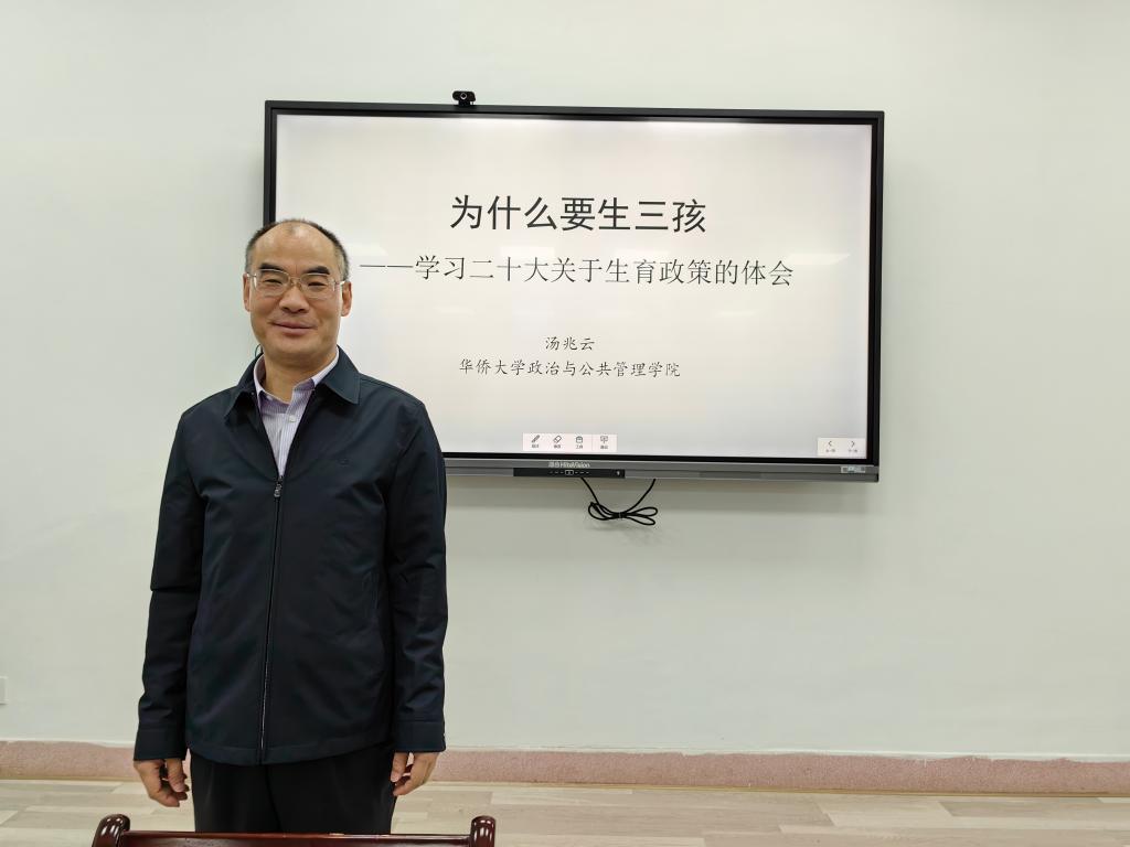 为了拓展PA视讯官网师生的专业视野,了解二十大之后人口研究最新动态、更熟练掌握论文选题的原则和方法,中国人口学理事、中国行政管理学会理事、福建省行政管理学会副会长、华侨大学政治与公共管理公司经理、博士生导师汤兆云教授于2023年3月24日应邀为公司师生作了《为什么生三孩-学习二十大报告关于生育政策的体会》和《研究生论文选题与写作》两场学术报告,分别有50多名本科生、40多名研究生和老师参与听讲并互动。