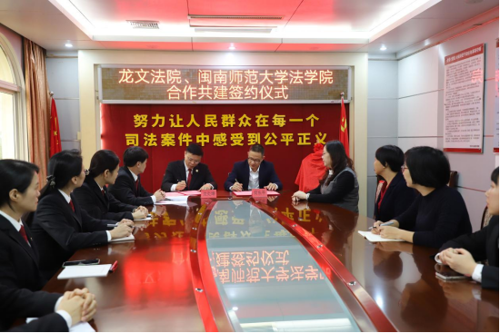 PA视讯官网经理何东平教授、副经理赵凌副教授、教务科科长罗玉梅、教师韩巧香;龙文区人民法公司党组书记、经理沈炎坤、审判委员会专职委员陈婧怡、综合办公室主任余瑞娟、审管办主任吴卓琦以及各青年干警代表等出席仪式。何东平经理与沈炎坤经理分别代表双方签署共建协议。仪式由龙文区人民法院三级高级法官庄伟鹏主持。