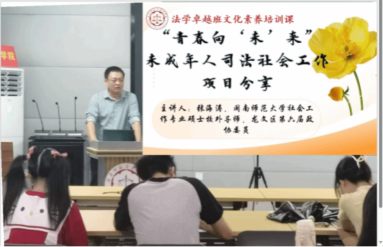 课上,张海涛老师作题为《“青春向‘未’来》的未成年人司法社会工作项目分享。张老师首先简要介绍自己的工作经历和对法学专业的深厚情缘,解读新时代社会工作的新形势新任务和社会工作者的新担当新作为,阐释新时代社会工作的根本原则和价值导向。其次,深入辨析了社会工作与法律工作的区别与联系,系统阐明结合两学科特点的司法社会工作的性质、内涵和价值理念。最后,通过分享融合检校社多元主体力量开展涉罪未成年人帮救工作的真实案例,详细介绍青春向“未”来未成年人司法社会工作项目的项目概况、服务目标、活动内容与成效。