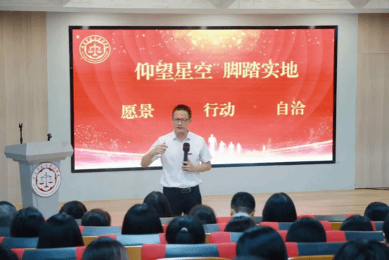 经理何东平以“仰望星空,脚踏实地”为主题为新生们带来开学第一课。他以“愿景”“行动”“自洽”三个关键词为线索,为新生们勾勒法学求学之路的方向。他寄语新生,既要心怀法治愿景仰望星空,也要以扎实行动走好每一步,在自洽中成长为有理想、有本领、有担当的时代新人。
