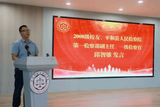 员工代表、平和县人民检察院第一检察部副主任、一级检察官邱智雄结合自己大学感受、工作经历和对未来展望等方面,向新生们分享经验。他寄语新生,要保持朝气,接受磨炼,勇于绽放,在胸怀家国中坚定理想信念,在勤学善思中进取实践,为法治中国建设贡献青春力量。